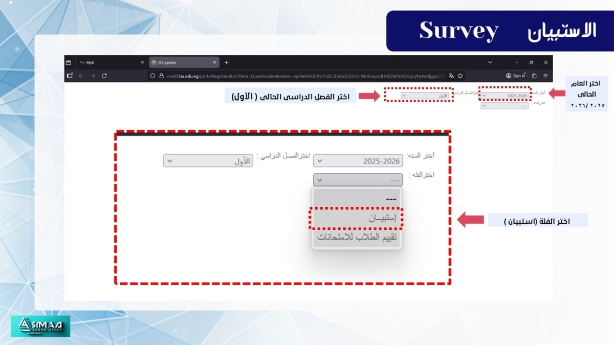 ويُشترط بعد الانتهاء من جميع البنود أن تظهر رسالة: (تم الانتهاء من هذا الاستبيان لهذا العام والفصل)